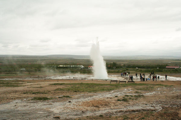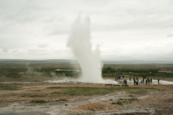Strokkur ist de aktivste Geysir im Haukadalur Tal. Alle 10 Minuten fängt die ruhige Oberfläche an zu blubbern und der Geysir bricht aus. Wenn du die Maus über die kleinen Bilder rechts bewegst, kannst du sehen wie sich die Eruption aufbaut.