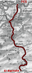 Onward, from Jbel Habri, past Timadhite was good mountain biking. Lots of up and down, and a bit breezy, but gorgeous nature. Finally the climb up to the Col du Zad - the highest point of my trip. That area is famous for its old-growth cedar forrests, which they are busily cutting down. From the Col du Zad, it was a magnificient, break-neck descent over 15 km down to 1400 m altitude, into the Moulouya valley. I poured water on the brakes, to cool the pads. Shortly after the pass, I got my first view of the snow-capped High Atlas.
