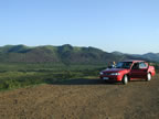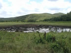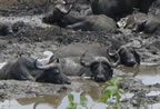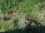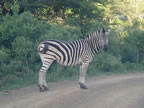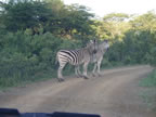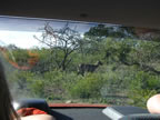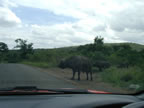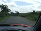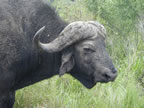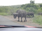 At one point in Hluhluwe we got really up-close and personal with a bunch of Cape Buffalo. That was even more exciting than the rhinos. Maybe the buffalo look like docile mooh-cows to you, but they are considered one of the most dangerous mammals on earth! We had been warned to leave the engine running when we see them, in order to make a quick escape, if necessary. In a magazine, I read a report of a ranger getting run over by a buffalo, after the ranger shot the animal three times with his high-powered rifle. So we were sitting in our little Toyota Corolla, engine running, and this buffalo appears, and checks us out, looking at us from roughly 10 feet (3 meters) away. He sniffed the air with his nostril while his brain was trying to decide whether we bothered him or not. At that point it dawned upon me that we were sitting in a bright red car! But I guess we checked out OK anyway, and he and his buddies went about their business. |