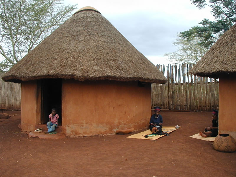The women are busy with bead work. They are wearing the traditional hats Zulu women wear. The buildings are very nice, probably a lot nicer than a most Zulu homes.