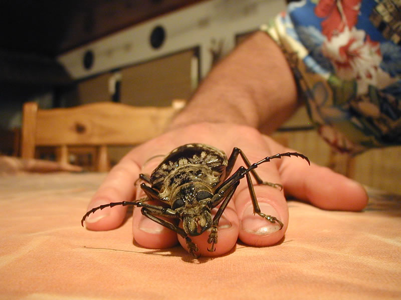 ![]() Check out this very cool Long Horn Beetle. We became buddies for a while, until, one night, he committed "pesticide" in the pool. Those pincers on his head are as powerful as they look! (top view) |