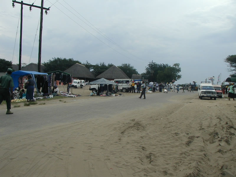 ![]() Market day in Mbaswana. The usually sleepy town becomes a bustling hub of activity. The large, straw-covered buildings on the left are covered market stalls. The gas station is visible on the right. |