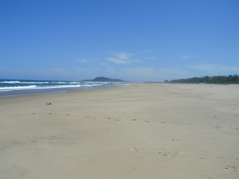 ![]() The flat area between the smaller, vegetated dunes on the right, and the larger one in the background, is where the estuary usually joins the ocean. When we were there, a drought had lowered the water levels in the estuary, so that it was not actually connected to the ocean. |