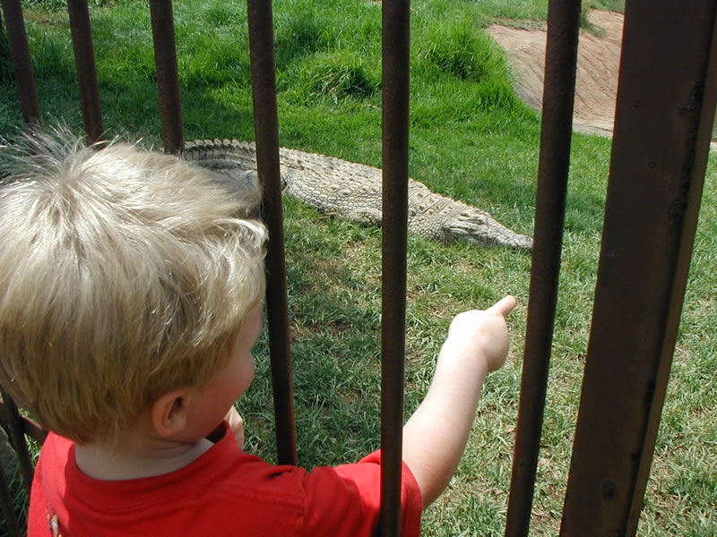 Jacob is fascinated by the huge nile crocodile basking in the sun.
