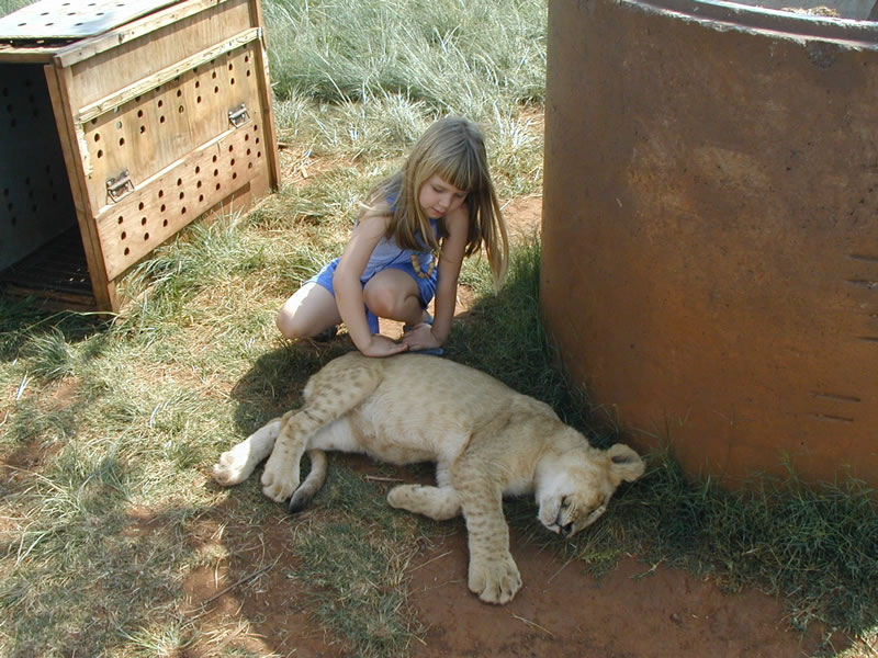 ![]() Julia really enjoyed petting the lions. Yet, she was also a bit cautious, which is very appropriate. These cubs are used to humans, but they like to play rough, and their huge paws do have claws. |